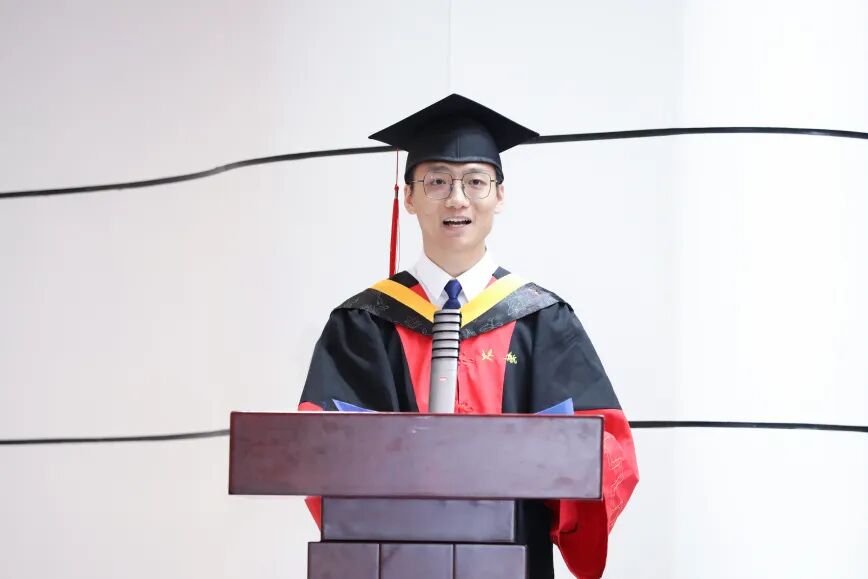 毕业生代表张楼悦向母校、学院、老师和亲友表达衷心感谢。他回顾了在校期间与同学们共同经历国家与学校的重要时刻,见证了“北航四系,王牌动力”的传承与荣耀。科研路上他深深体会到“静水流深”的力量,感恩学院与导师培养出坚韧不拔、脚踏实地的学术品格。他号召全体毕业生肩负起新时代航空动力人的使命,扎根奋斗、绽放芳华。