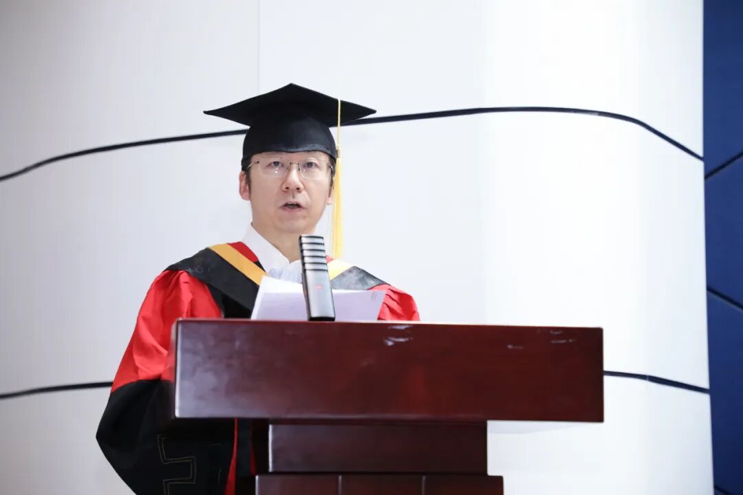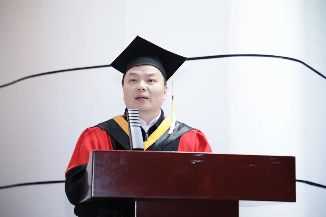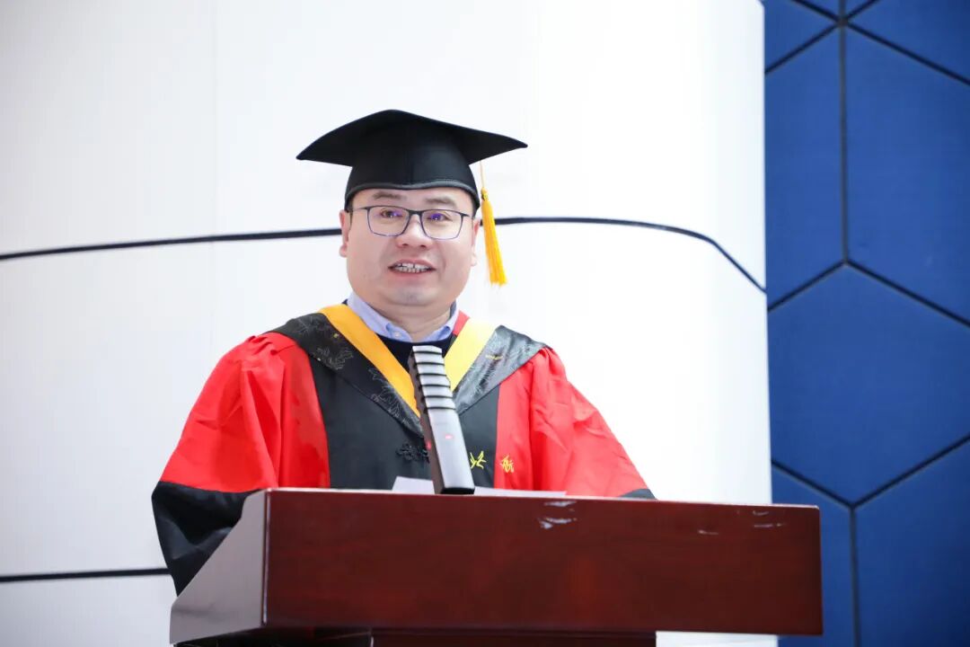 教师代表邱璐向全体毕业生致以最热烈的祝贺。在送别之际,他以“三颗心”勉励全体毕业生:一是坚守报国之心,将个人梦想融入祖国发展敢于创新、勇闯前沿;二是永葆赤子之心,保持对世界的好奇、对理想的纯粹、对生命的热爱,不失真诚与热忱;三是常怀感恩之心,将父母、师长所赋予的恩情化为前行的力量,以行动回馈家国。