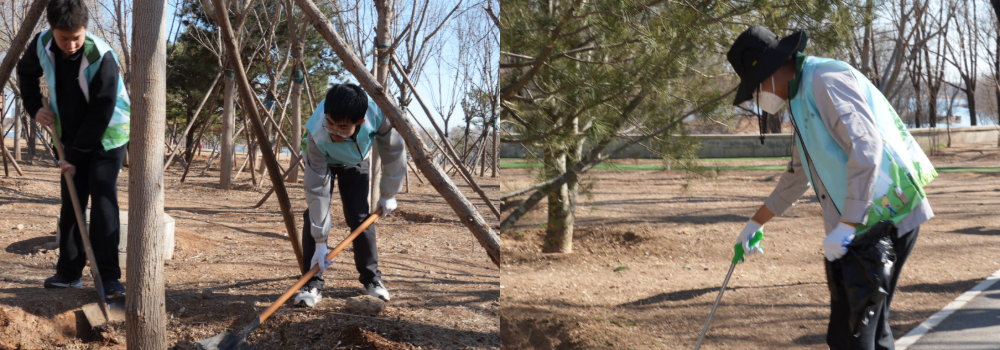 在植树节志愿活动中,我在老师傅的指导下为树木松土挖坑,为进一步蓄水做准备,简单清理捡拾周边垃圾。虽然只是简单的劳动,却让我真切感受到守护绿色的意义。看着整洁的环境、得到养护的树木,心里格外踏实。这次活动让我明白,保护环境不在口号,而在每一次实际行动。今后我会继续践行环保,用小事守护家园。——赵涵宽